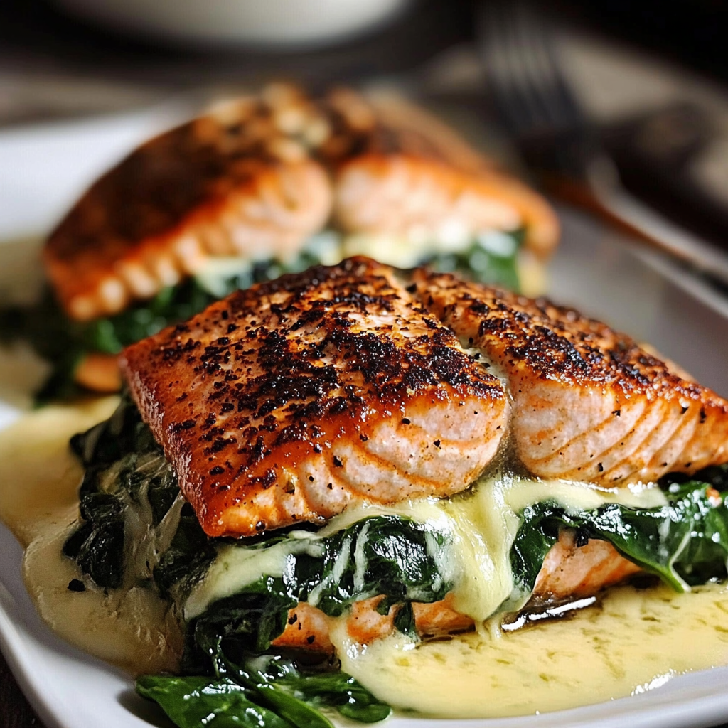 Ce plat de saumon noirci farci aux épinards et au parmesan est un mélange de textures et de saveurs parfaites. Le saumon, croustillant à l’extérieur, est garni d’une farce crémeuse à base d’épinards et de fromage, apportant une touche de fraîcheur et de douceur, tandis que les épices ajoutent une note chaude et savoureuse. Découvrez cette recette gourmande et équilibrée, qui se marie bien avec du riz, une salade verte, ou des légumes rôtis.