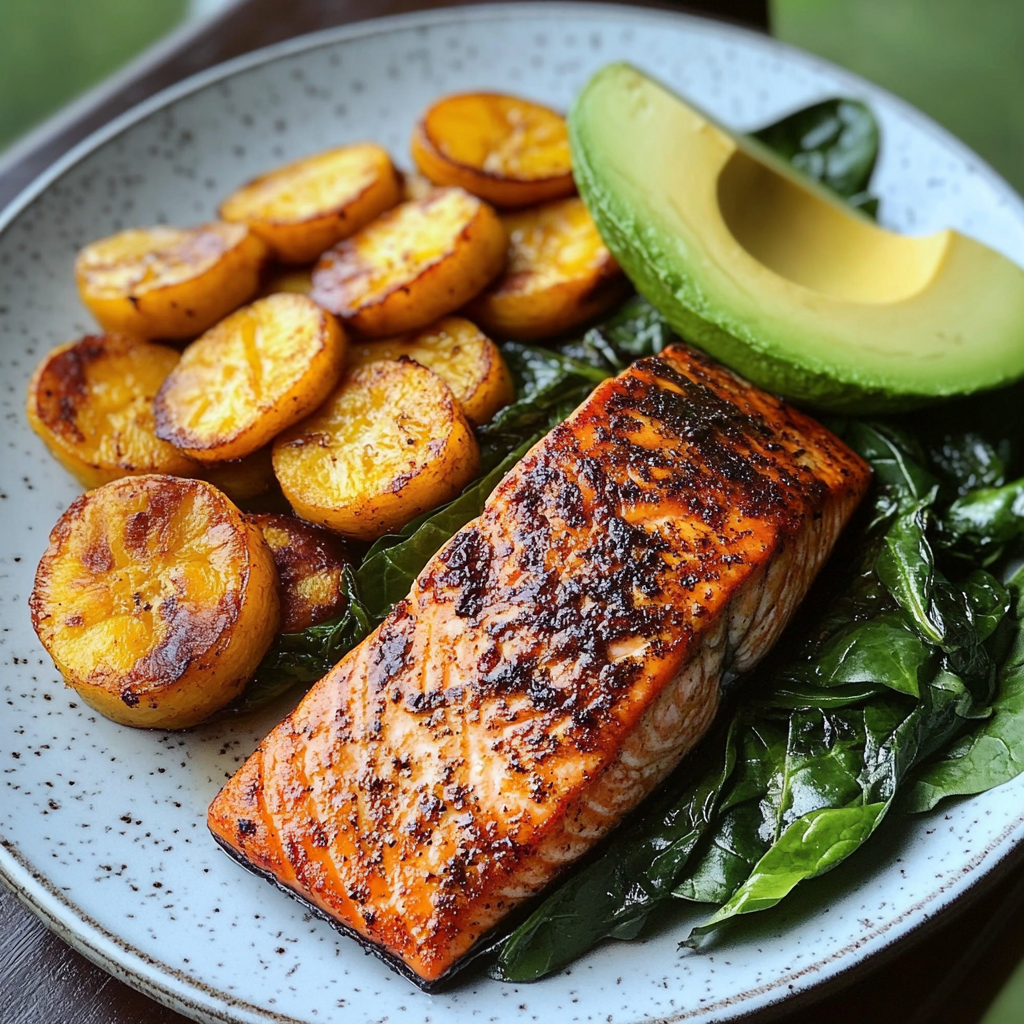 Saumon Poêlé avec Plantains, Épinards Sautés et Avocat : Un Repas Équilibré et Savoureux