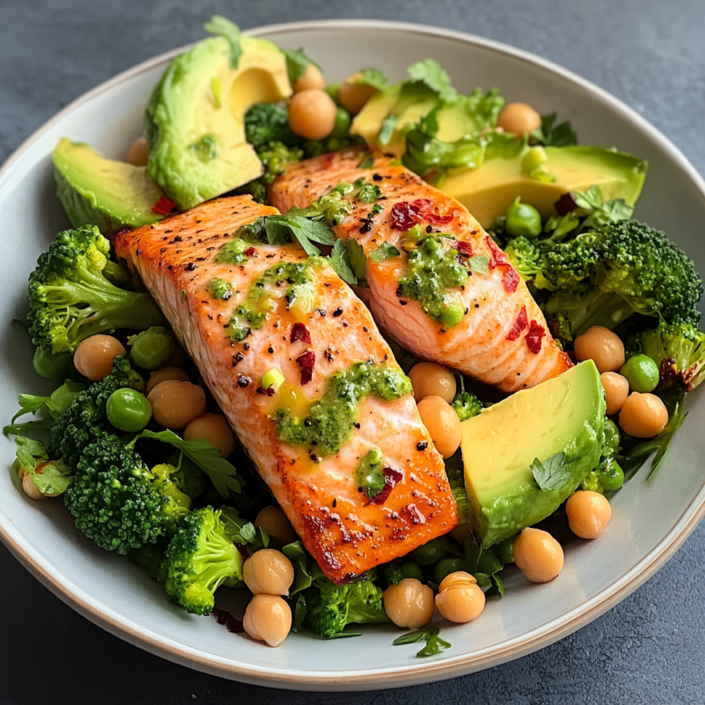 Saumon Rôti avec Salade de Pois Chiches, Brocoli et Avocat : Un Délice Sain et Gourmand