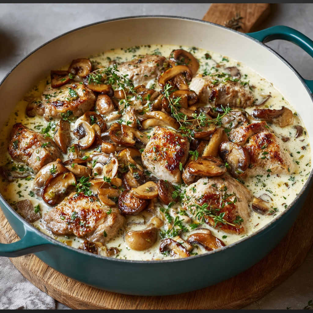 Cette recette séduit par son équilibre entre rusticité et gourmandise. Le porc, bien mijoté, devient fondant et juteux, tandis que les champignons apportent une note boisée délicate qui enrichit la sauce. L’oignon et l’ail viennent relever subtilement l’ensemble, et la crème fraîche offre une texture onctueuse irrésistible.