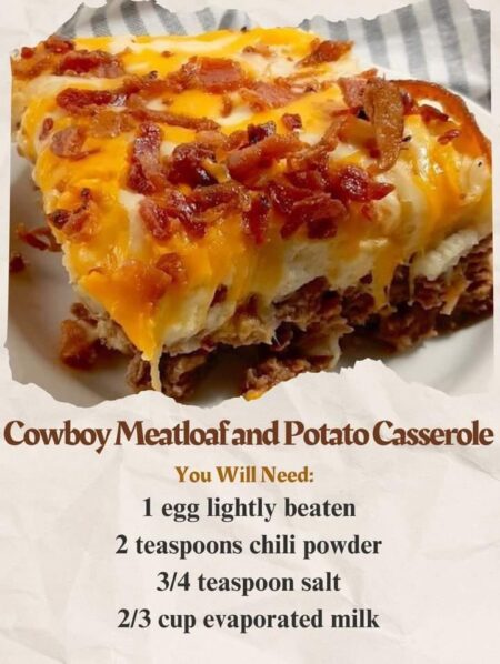 This Cowboy Meatloaf and Potato Casserole is a celebration of flavors, blending the savory goodness of meatloaf with creamy, cheesy mashed potatoes and crispy bacon. With each forkful, experience the warmth and satisfaction of a meal that’s both comforting and delicious, perfect for gatherings or cozy family dinners.