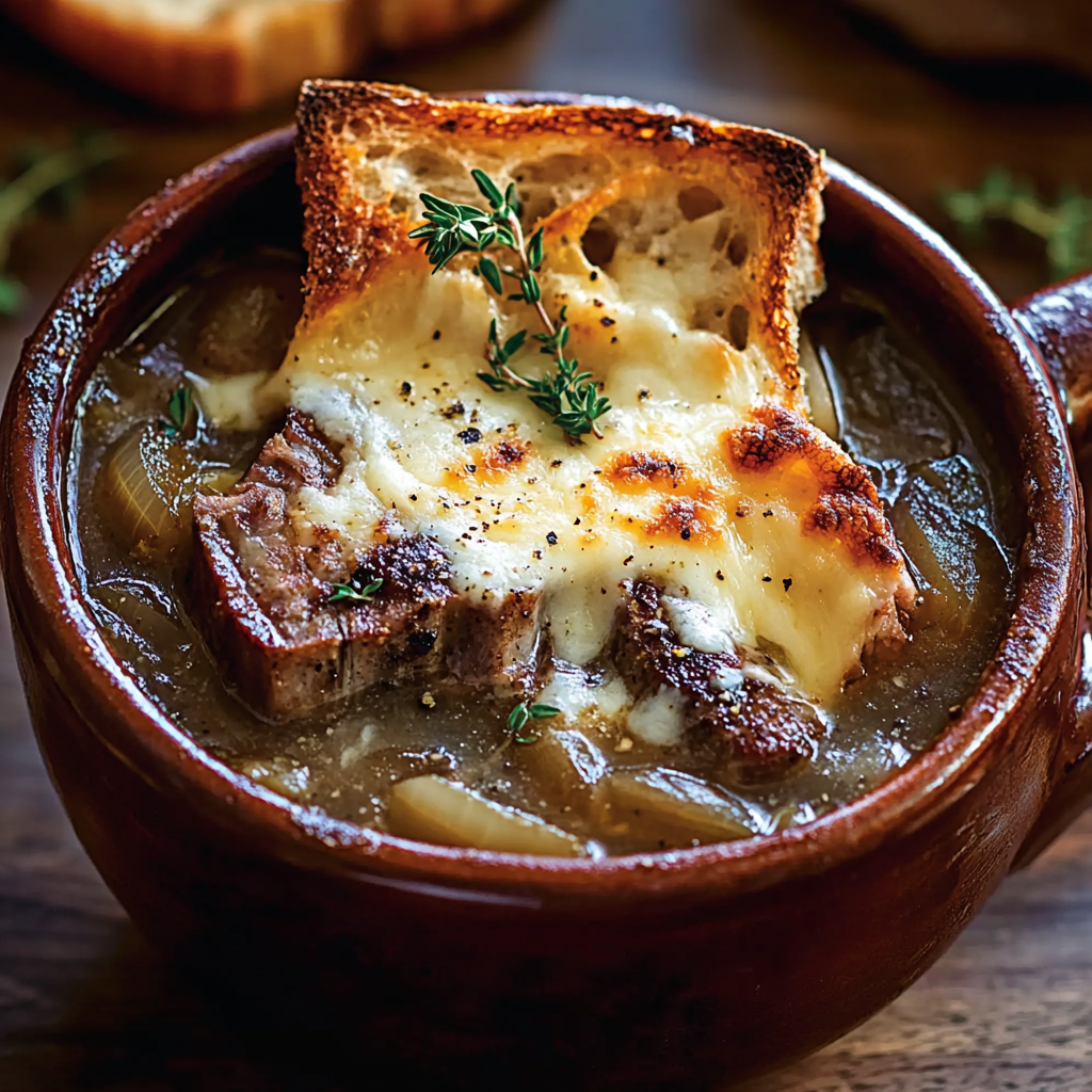 Un mélange savoureux de soupe à l’oignon riche et de toast croustillant au fromage Gruyère.