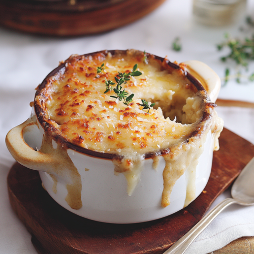 - Ajout de croûtons : Pour encore plus de texture, ajoutez des croûtons maison au fond des bols avant de verser la soupe et de gratiner. Les croûtons absorberont une partie du liquide tout en restant croustillants.