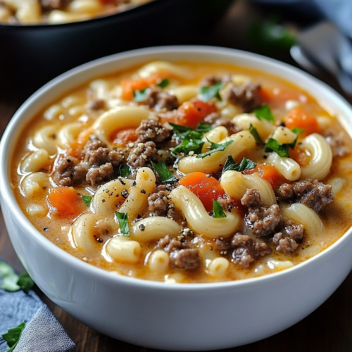 La soupe cheeseburger aux macaronis est une alliance parfaite entre la chaleur réconfortante d’une soupe et les saveurs riches d’un cheeseburger classique. Cette recette est un excellent choix pour les repas en famille ou entre amis, surtout lorsque vous souhaitez préparer un plat délicieux sans passer des heures en cuisine. Préparée en une seule casserole, elle est pratique, savoureuse et ravira tous les amateurs de fromage et de pâtes.