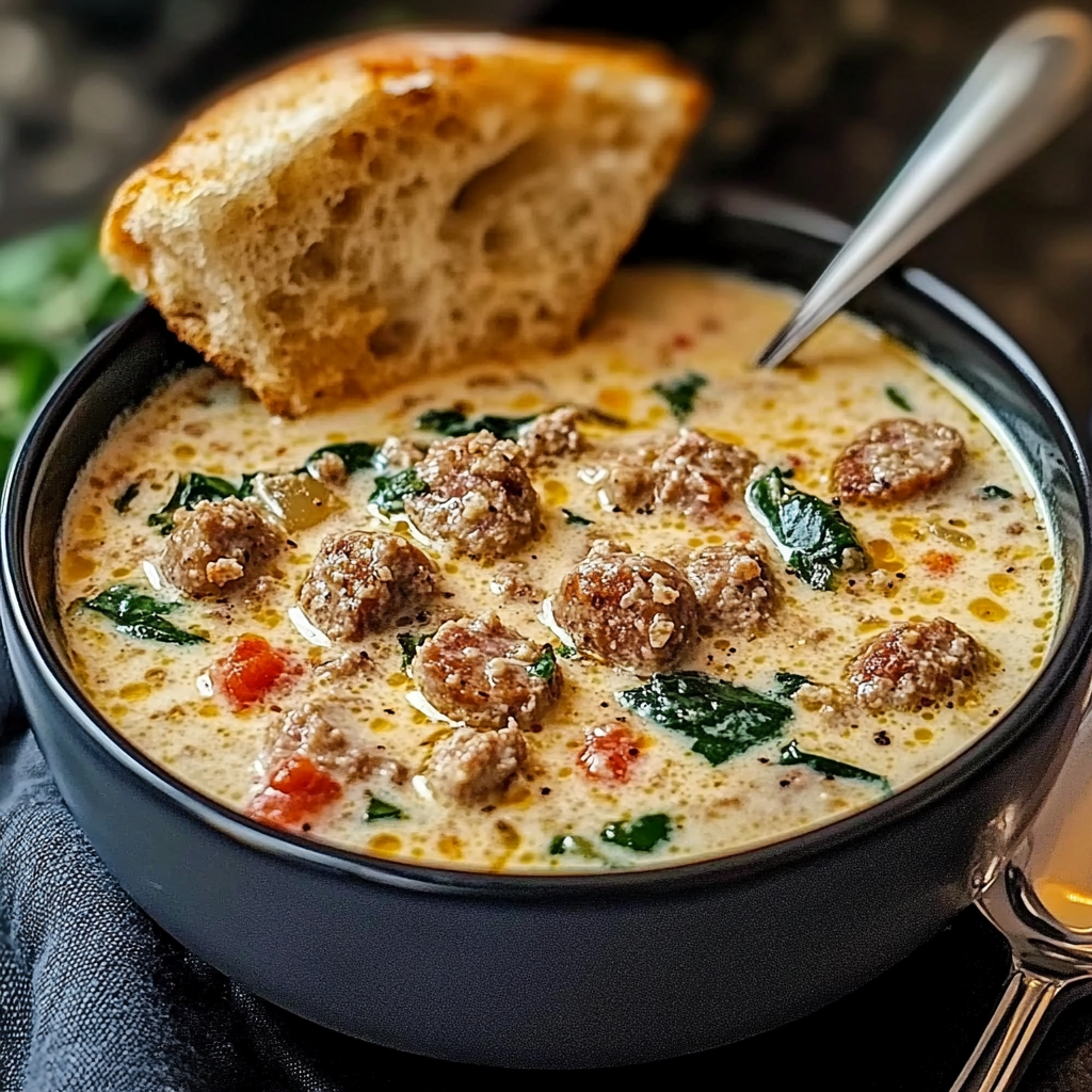 La soupe crèmeuse au parmesan et saucisse italienne est un plat réconfortant et plein de saveurs, idéal pour les journées fraîches ou lorsque vous avez envie d’un repas copieux et délicieux. Cette soupe, avec sa texture riche et crémeuse, est agrémentée de saucisse italienne savoureuse, d’ail parfumé, et de bouillon de poulet. Elle devient encore plus irrésistible lorsqu’elle est accompagnée de parmesan râpé pour un goût encore plus intense.