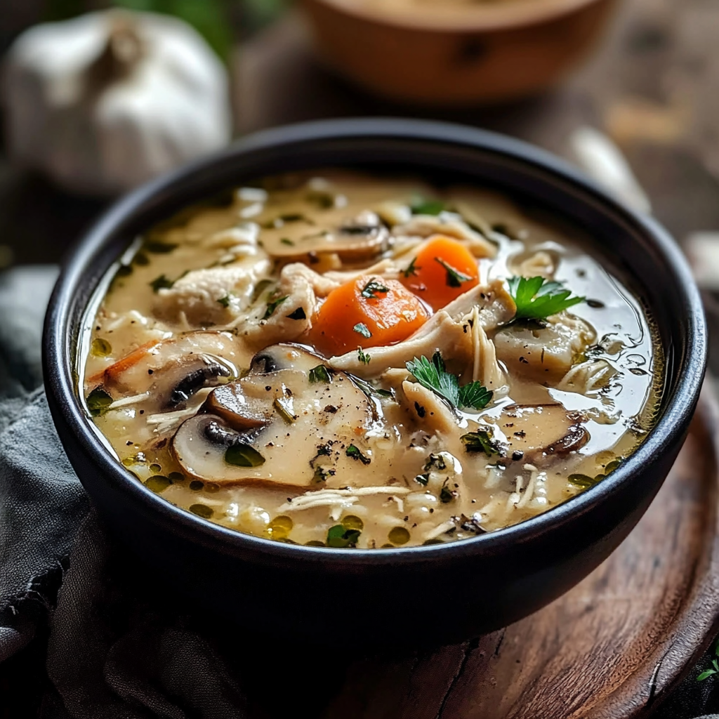 Soupe Crémeuse au Poulet, Champignons et Riz Sauvage