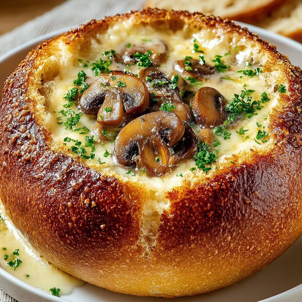 Pour servir, on verse la soupe chaude directement dans les pains boule et on dispose les chapeaux à côté. On peut garnir la surface avec quelques lamelles de champignons sautés, un filet de crème supplémentaire ou quelques feuilles de persil frais. La présentation dans le pain boule apporte à la fois originalité et praticité, tout en offrant une texture unique lorsque l’on trempe la mie croustillante dans la soupe crémeuse.