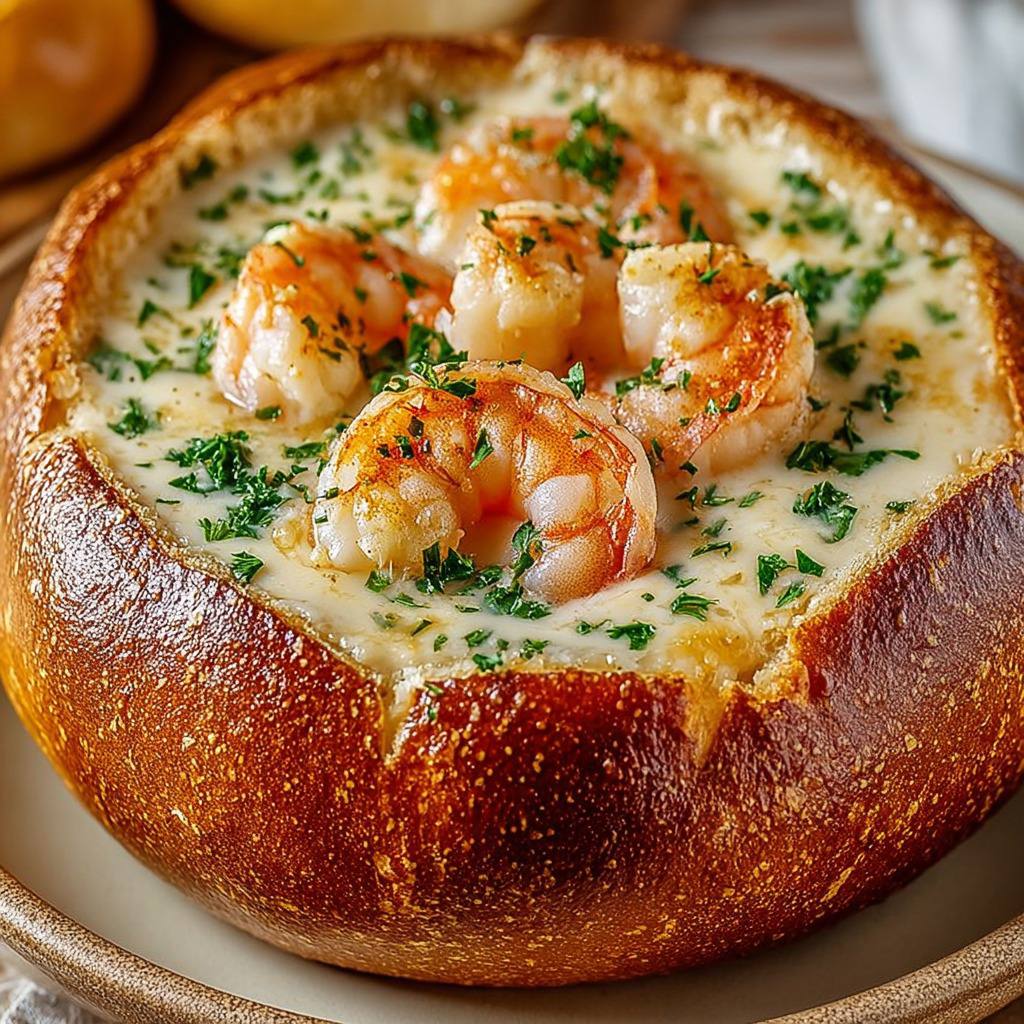 Soupe Crémeuse aux Crevettes et Ail en Pain Boule