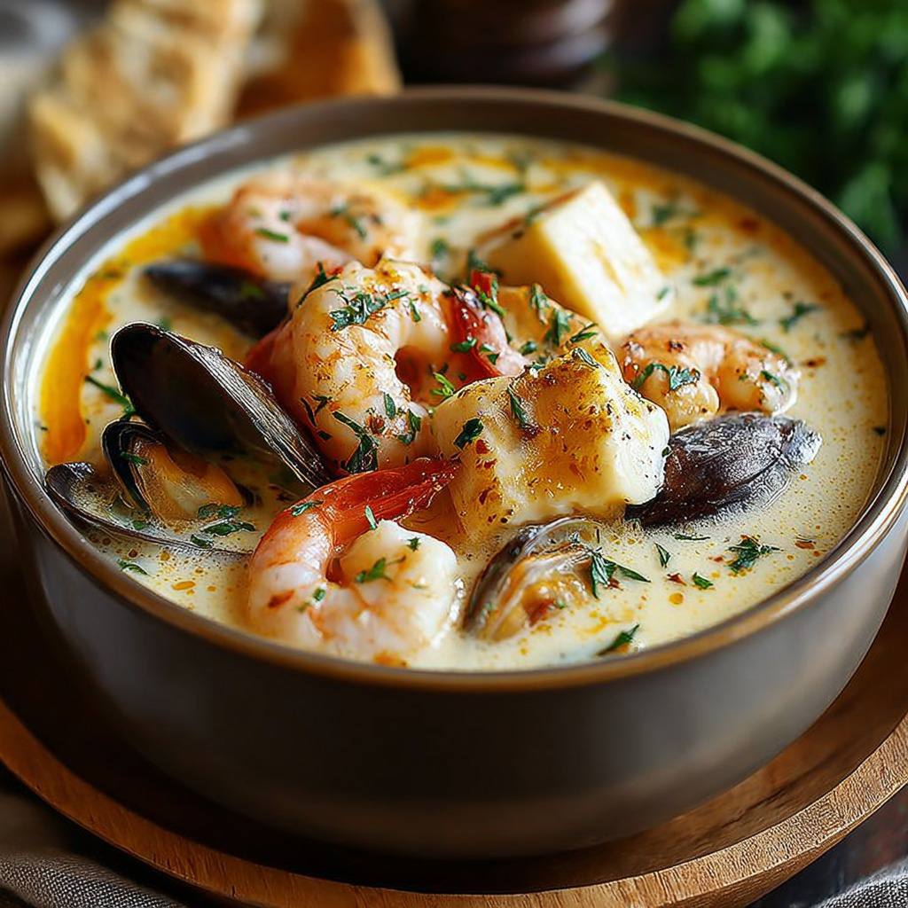 La soupe crémeuse aux fruits de mer appartient à cette grande famille de plats réconfortants qui réussissent à combiner générosité, raffinement et simplicité. Elle met en valeur la richesse des produits de la mer tout en exploitant la douceur des légumes et l’onctuosité d’une base crémeuse. On y retrouve l’esprit des côtes maritimes, où les produits fraîchement pêchés sont souvent transformés en soupes ou ragoûts, que ce soit pour nourrir les familles de pêcheurs ou pour servir d’entrée raffinée lors des repas de fête. Sa popularité vient de sa capacité à séduire tous les palais, en offrant un goût équilibré, iodé et rond à la fois.