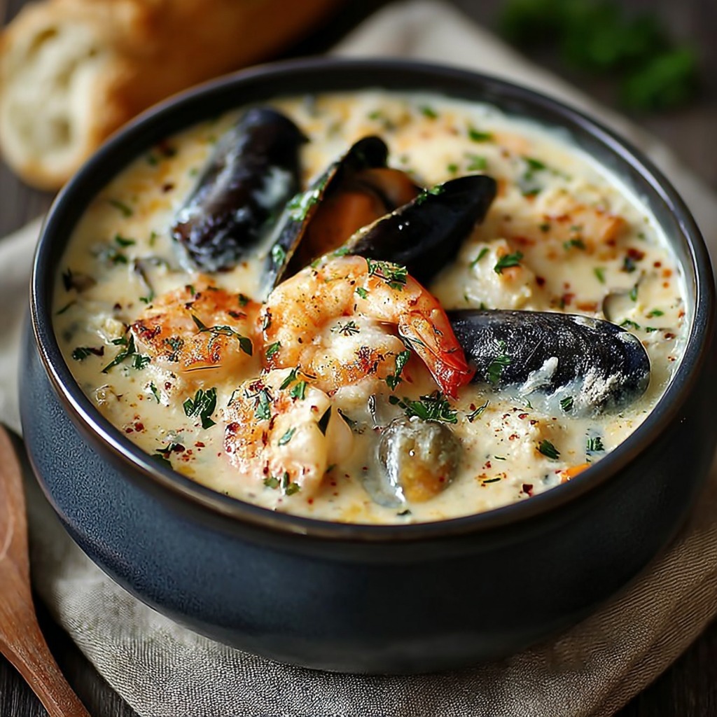 La soupe crémeuse aux fruits de mer combine une base douce et veloutée avec la saveur iodée des crustacés et mollusques. La crème adoucit légèrement l’acidité du vin blanc et des fruits de mer, tandis que le piment doux ou paprika apporte une note subtilement épicée. Chaque cuillère offre une harmonie entre la richesse de la sauce et la fraîcheur des fruits de mer.