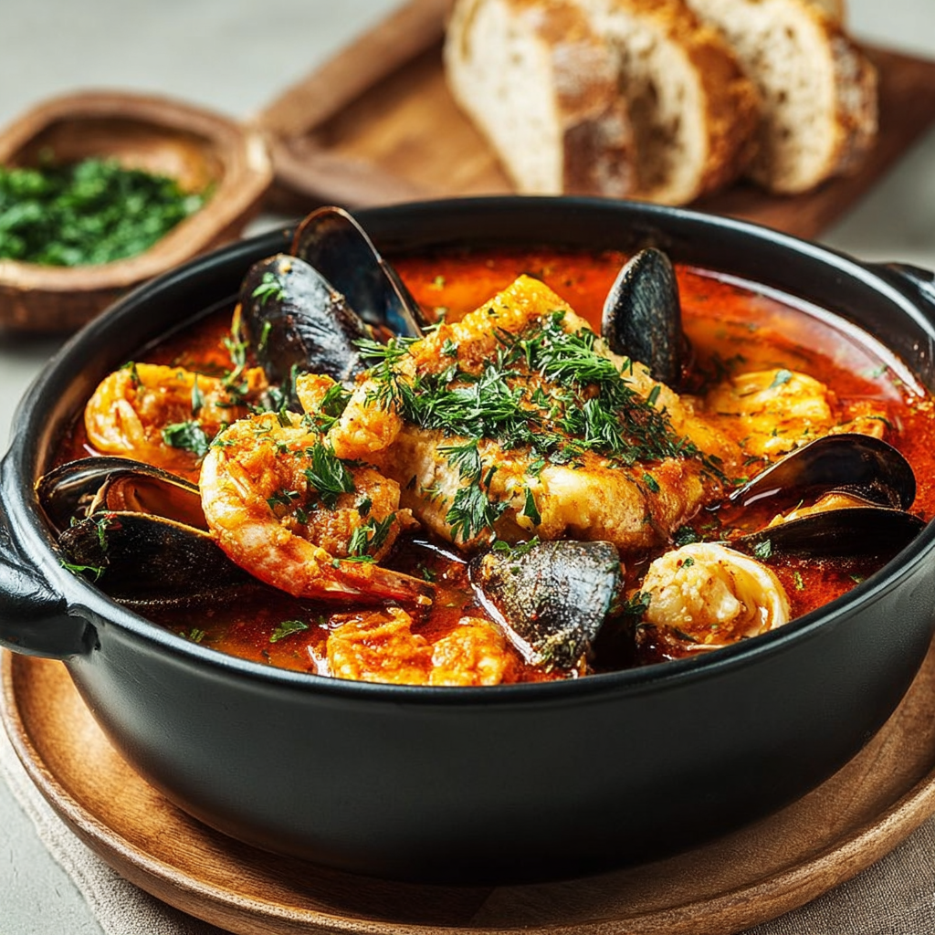 Cette soupe méditerranéenne associe la douceur des poissons blancs, la saveur iodée des fruits de mer et la richesse aromatique de la tomate. Elle est nourrissante, parfumée et idéale en entrée raffinée ou en plat principal accompagné de pain croustillant.