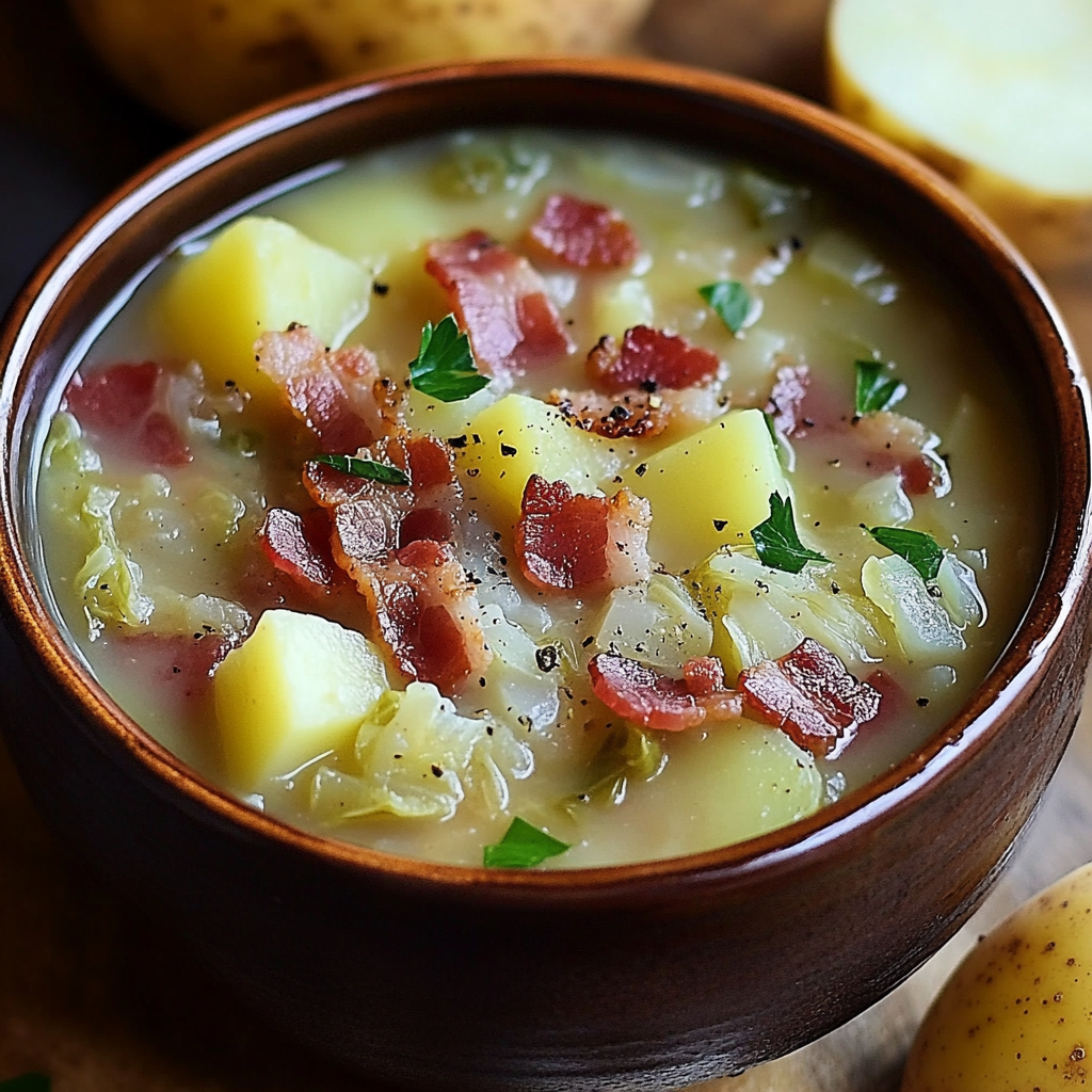 La soupe irlandaise au bacon, chou et pommes de terre est un plat classique qui réchauffe le cœur et l’âme. Avec des ingrédients simples et accessibles, elle est parfaite pour un dîner réconfortant ou une occasion spéciale. Que vous soyez en train de passer une journée froide d’hiver ou que vous cherchiez simplement à vous régaler avec une soupe riche et savoureuse, cette recette est faite pour vous.