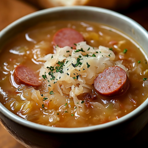 La combinaison du kielbasa fumé et de la choucroute acide crée un contraste de saveurs très apprécié, surtout pendant les mois d’hiver. La douceur de l’oignon et de l’ail, combinée à la richesse du bouillon de poulet, équilibre parfaitement la soupe, la rendant à la fois nourrissante et réconfortante.