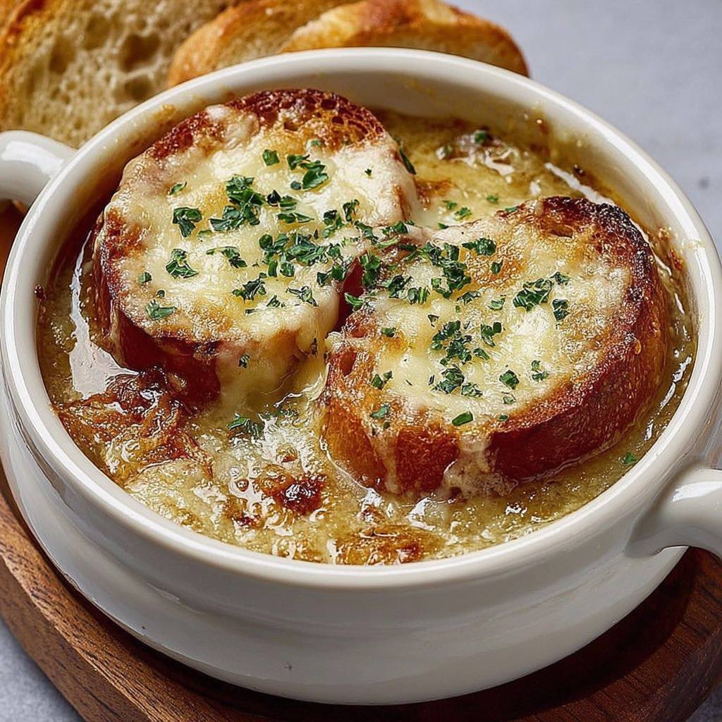 Soupe à l’oignon avec croûtons au camembert est ainsi un plat complet, gourmand et convivial, capable de transformer un repas simple en un moment chaleureux et raffiné. Elle illustre l’art de la cuisine française : patience, maîtrise des cuissons, équilibre des saveurs et respect des ingrédients. Chaque étape, de la caramélisation des oignons à la préparation des croûtons au fromage, contribue à un résultat harmonieux, savoureux et visuellement appétissant.