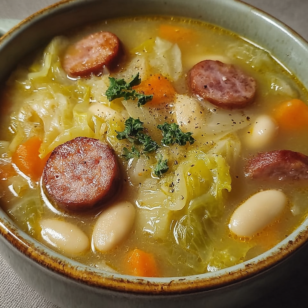 Nom du plat : Soupe rustique au chou, saucisse et haricots blancs