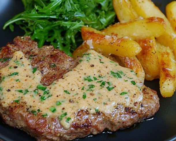 4. Finalisation : Remettez les steaks dans la poêle et nappez-les généreusement de sauce. Laissez mijoter 2 à 3 minutes pour que les saveurs se mélangent et que la sauce épaississe légèrement.