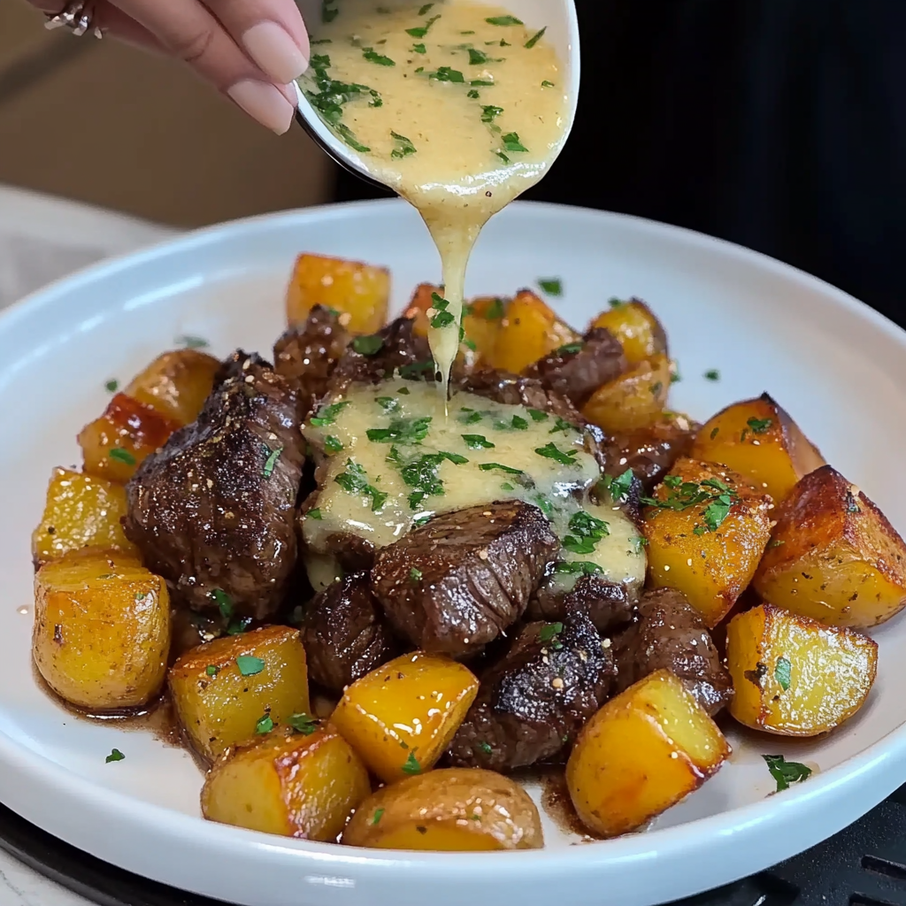 Servez dans une assiette chaude. Disposez les pommes de terre d’un côté, les morceaux de steak de l’autre, arrosez de beurre à l’ail, et ajoutez une pincée de persil frais et une rondelle de citron. Un visuel digne d’un bistro français.