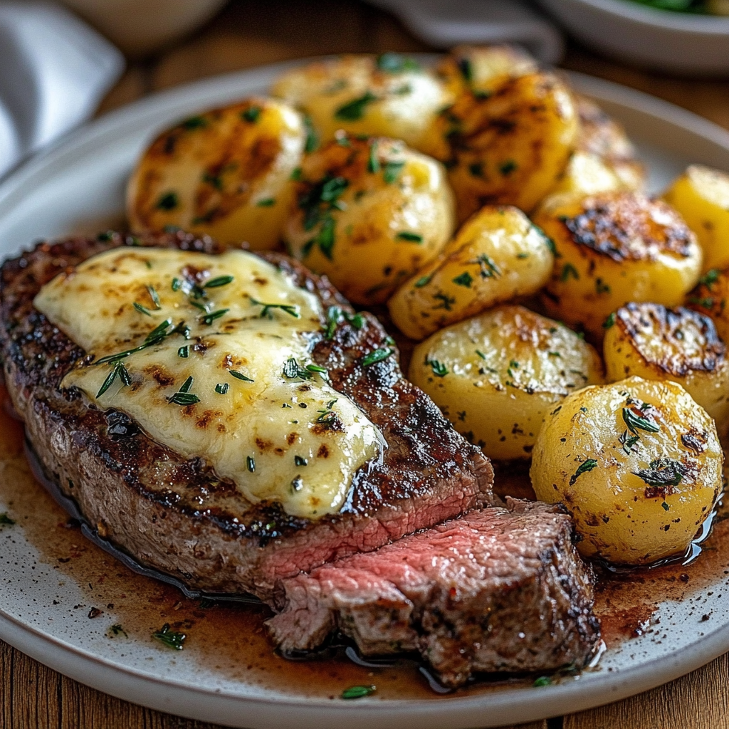 Ajout du steak : Ajoutez quelques tranches de steak de côte juteux à côté, arrosées d’un peu de jus de cuisson au beurre.