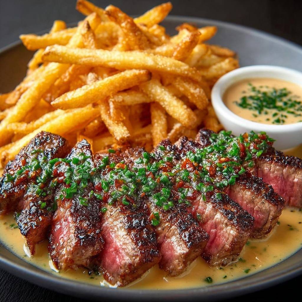 Il existe de nombreuses variantes autour de ce duo. Les frites peuvent être préparées au four avec un filet d’huile d’olive pour une version plus légère. On peut également utiliser des pommes de terre de variétés différentes, certaines donnant des frites plus farineuses, d’autres plus fermes. Côté viande, on peut remplacer l’entrecôte par un rumsteck, une bavette ou même un onglet, morceaux appréciés pour leur goût marqué. La cuisson à la poêle peut aussi être remplacée par une cuisson au grill, qui apporte une saveur fumée très agréable.