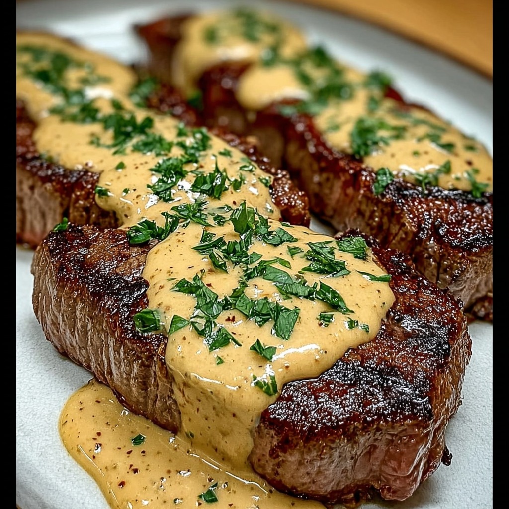 Servir les steaks sur des assiettes chaudes, nappés de sauce crémeuse au poivre. Parsemer de persil frais pour la décoration et accompagner de pommes de terre sautées, de légumes grillés ou d’une purée de pommes de terre maison. La combinaison de textures – viande tendre, sauce veloutée et accompagnements croquants ou fondants – crée un équilibre harmonieux et gourmand.