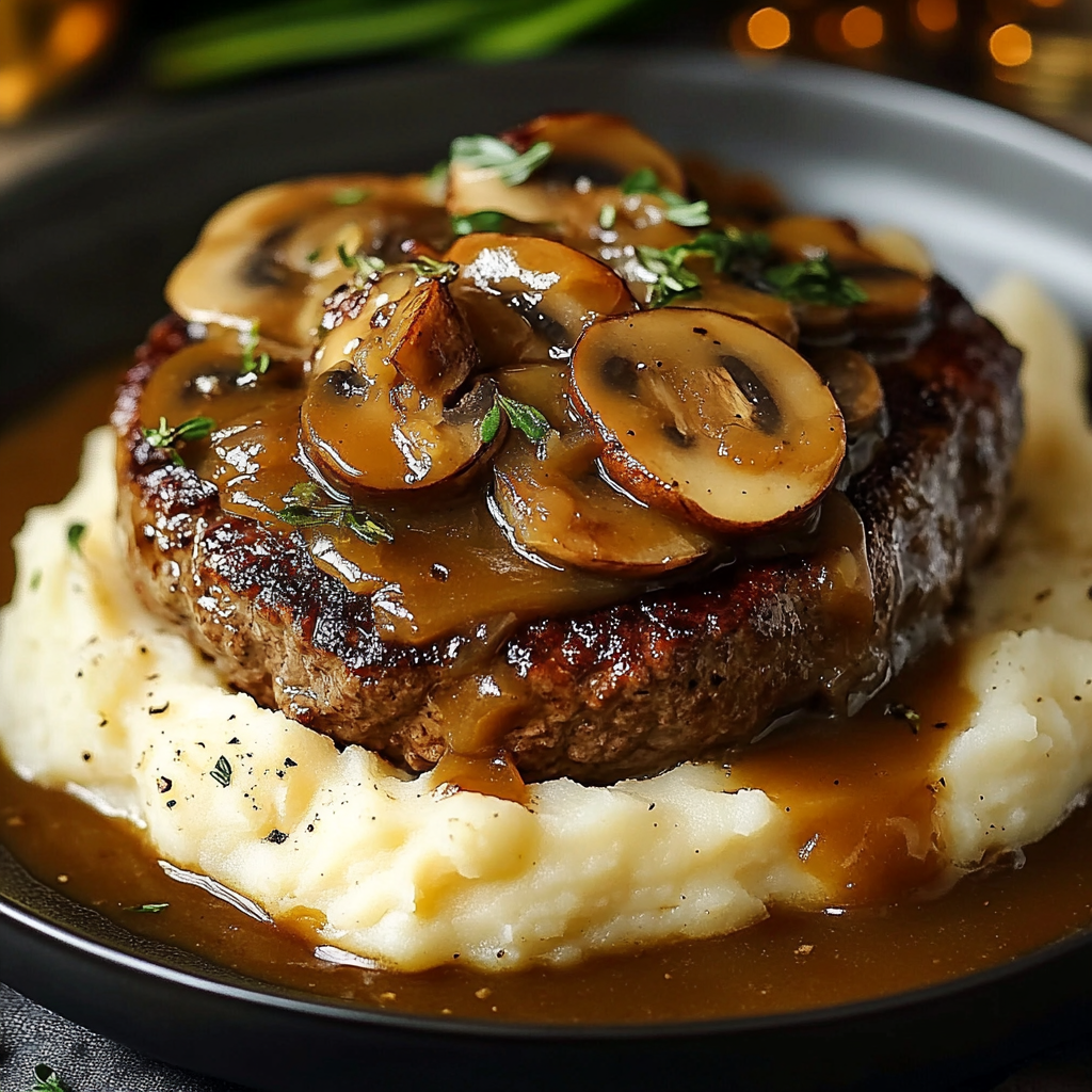 Un steak Salisbury savoureux accompagné de purée d’ail onctueuse et d’une sauce aux champignons riche.