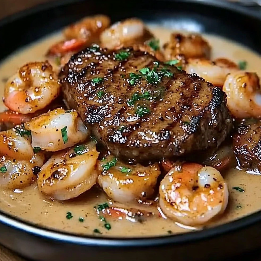 Un plat digne d’un restaurant, prêt à la maison ! Du steak juteux nappé d’une sauce cajun crémeuse aux crevettes – un pur bonheur !