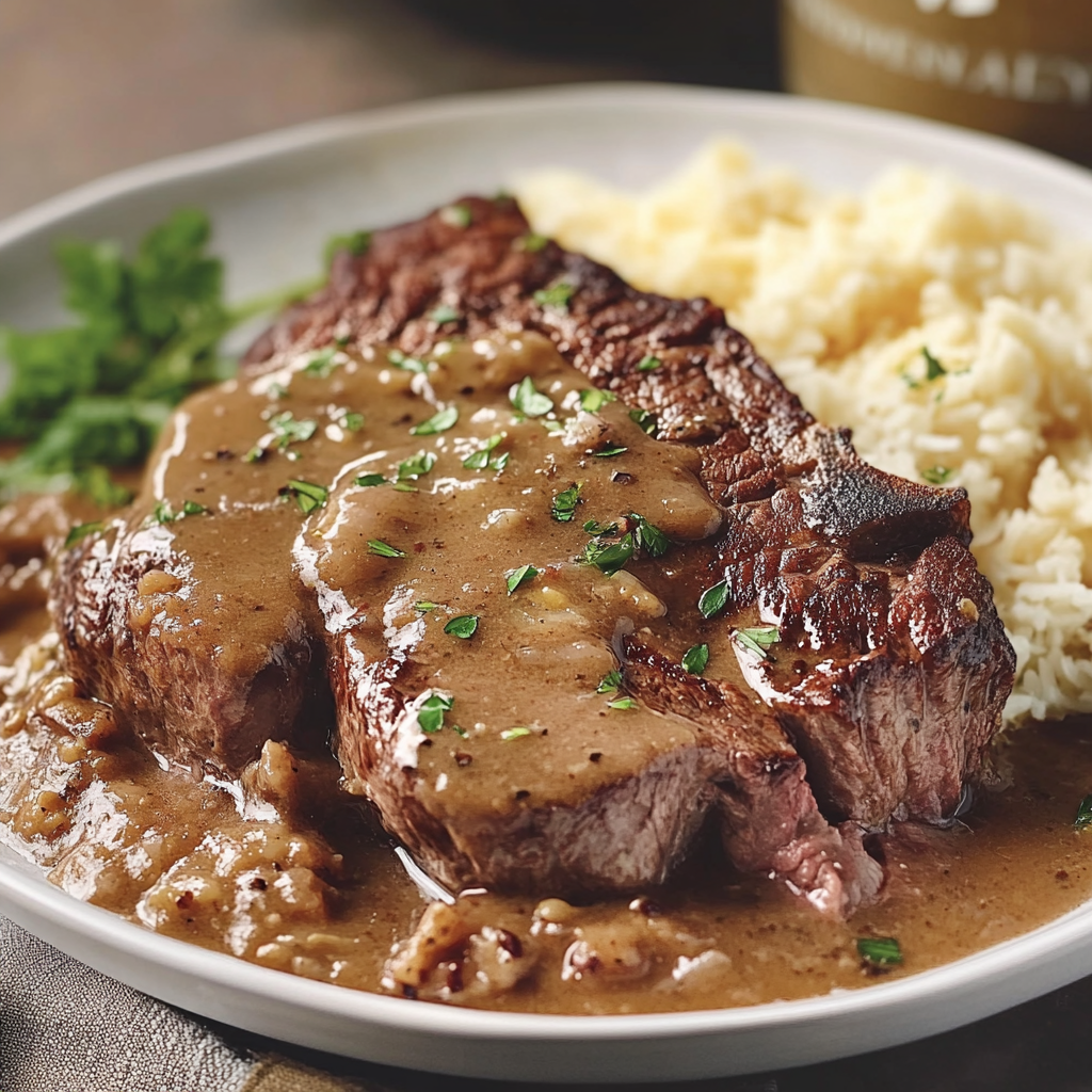 Lorsque les steaks sont cuits, servez-les sur une purée de pommes de terre maison ou sur un lit de riz pour absorber toute la délicieuse sauce. Garnissez de persil frais pour une touche de couleur et de fraîcheur.