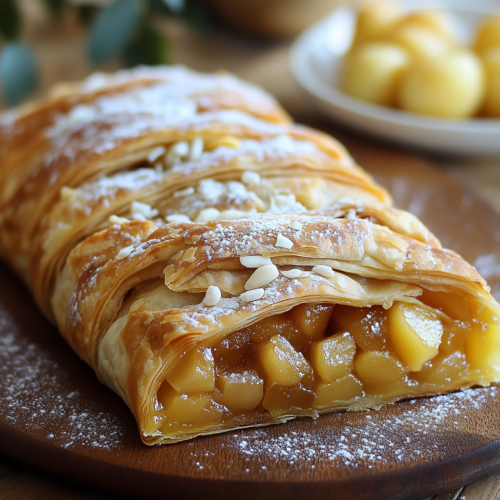 Faites cuire dans un four préchauffé à 180°C (350°F) pendant 35 à 40 minutes, jusqu’à ce que le strudel soit doré et croustillant. Vous pouvez vérifier la cuisson en insérant une brochette ou un cure-dent dans la pâte : il doit en ressortir sec. - Laisser refroidir légèrement :