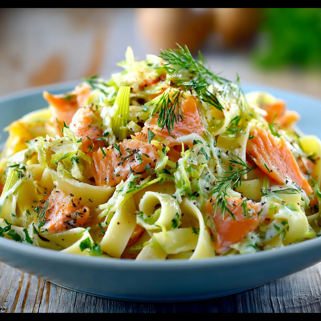Les tagliatelles aux poireaux et saumon sont l’exemple parfait d’un plat à la fois simple et raffiné. Ce mariage entre la douceur légèrement sucrée du poireau et la richesse du saumon donne naissance à une recette crémeuse, délicate et très parfumée. C’est un plat qui évoque immédiatement la cuisine maison chaleureuse, tout en restant suffisamment élégant pour être servi lors d’un dîner entre invités.