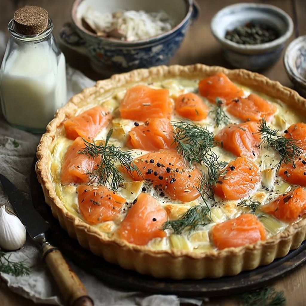 Cette recette est un classique de la cuisine française simple et raffinée, qui plaira aussi bien aux petits qu’aux grands. La douceur des poireaux se marie parfaitement avec la richesse du saumon et la fraîcheur du fromage frais. L’équilibre des textures entre la pâte croustillante et la garniture moelleuse en fait un plat complet et savoureux.