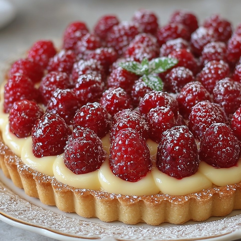 Pour une saveur plus aromatique, on peut parfumer la crème pâtissière avec un zeste de citron finement râpé ou quelques gouttes d’eau de fleur d’oranger. Ces arômes subtils rehaussent le goût de la vanille et se marient parfaitement avec l’acidité des framboises. Une autre variante consiste à ajouter une fine couche de confiture de framboises entre le fond de tarte et la crème pâtissière pour renforcer la présence fruitée. Si les framboises ne sont pas de saison, elles peuvent être remplacées par des framboises surgelées préalablement décongelées et bien égouttées, ou encore par d’autres fruits rouges comme les fraises, les mûres ou les myrtilles. Pour un contraste de texture, on peut parsemer quelques éclats de pistaches torréfiées ou d’amandes effilées sur la surface juste avant de servir.