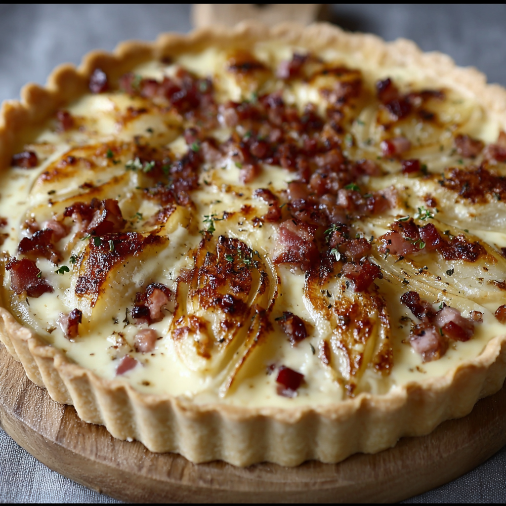 La tarte fondante au camembert, lardons et pommes est un véritable concentré de convivialité et de saveur.