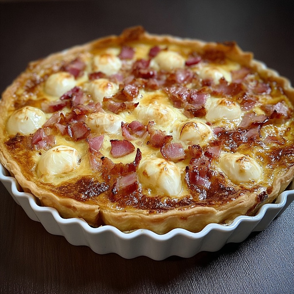 La pâte brisée pur beurre sert de socle à la garniture. Elle doit être légèrement croustillante sur les bords et tendre à l’intérieur. Sa neutralité permet aux saveurs des oignons, lardons et fromage de s’exprimer pleinement. Un pré-cuits léger garantit que la pâte ne s’humidifie pas sous la garniture.