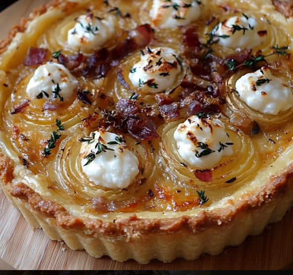 Voici une recette gourmande de Tarte Oignon, Lardons, Chèvre et Miel, alliant le sucré-salé dans une pâte brisée croustillante. Idéale pour un dîner convivial, une entrée raffinée ou un repas automnal, elle se prépare en 45 minutes et régale jusqu’à 6 personnes.