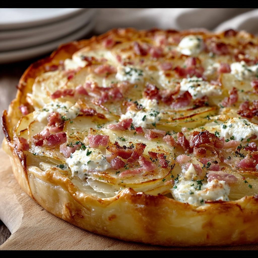 Cette tarte rustique et gourmande, simple à préparer, constitue un plat familial classique, riche en saveurs et en textures, idéal pour un déjeuner ou un dîner réconfortant, mettant en valeur l’association intemporelle de pommes de terre, camembert et lardons.
