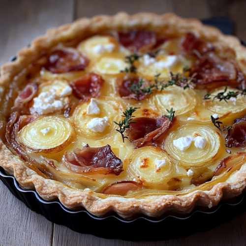 La Tarte Sucrée-Salée Oignon, Lardon, Chèvre et Miel est un plat qui associe des saveurs riches et variées, parfait pour vos repas de famille ou pour un dîner chic. Cette tarte marie parfaitement le sucré et le salé, avec des oignons caramélisés, des lardons savoureux, du fromage de chèvre crémeux, et un filet de miel qui apporte une touche de douceur. C’est une recette idéale pour ceux qui aiment les contrastes de saveurs dans leurs plats.