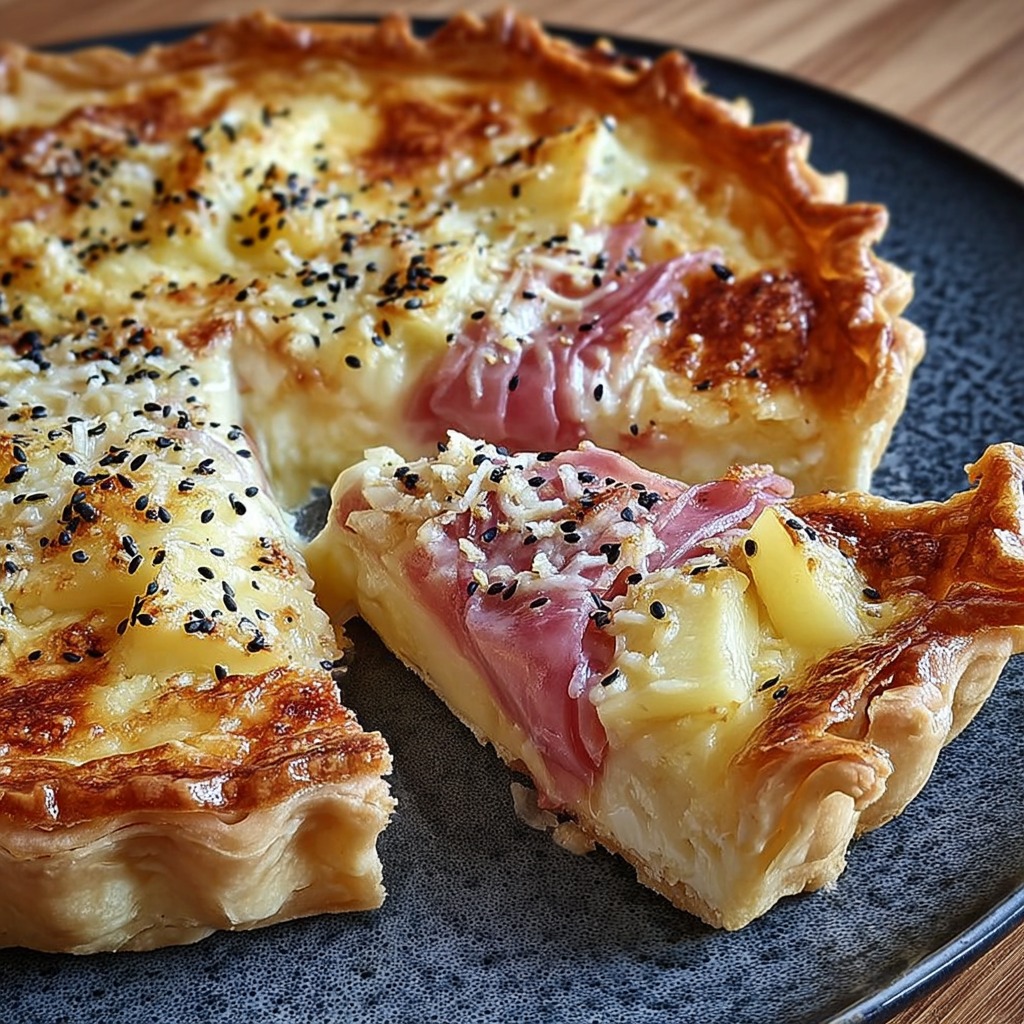 Enfourner la tarte pendant 25 à 30 minutes jusqu’à ce que le fromage soit fondu et doré, et que la crème ait légèrement épaissi. Surveiller la cuisson pour éviter que le fromage ne brûle et pour conserver une pâte bien dorée et croustillante. Laisser reposer quelques minutes avant de découper pour que la garniture se stabilise et que les parts se tiennent mieux.