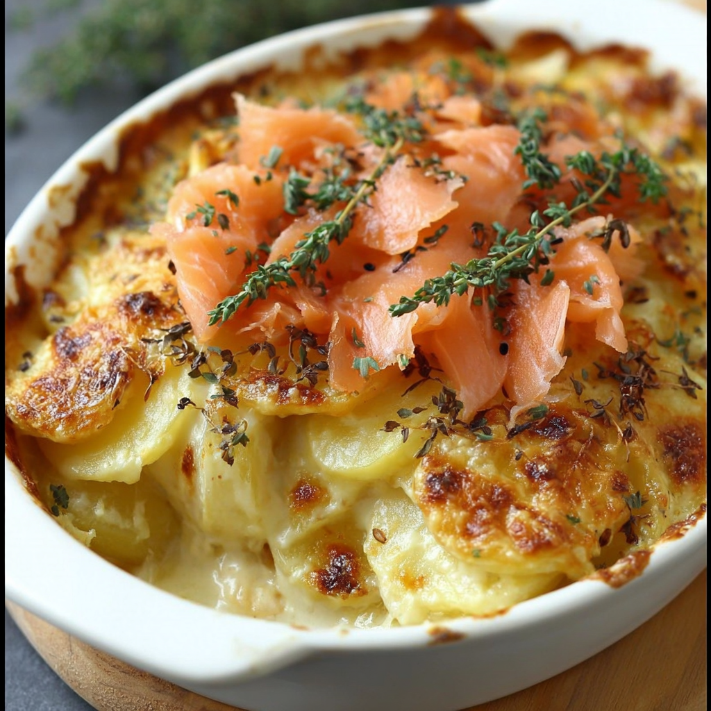 La tartiflette au saumon fumé façon chic est une variation contemporaine et raffinée de ce classique. En remplaçant les lardons par du saumon fumé, on obtient un gratin léger et élégant, parfait pour un dîner raffiné ou pour impressionner des invités tout en conservant le confort et le crémeux caractéristiques de la tartiflette.