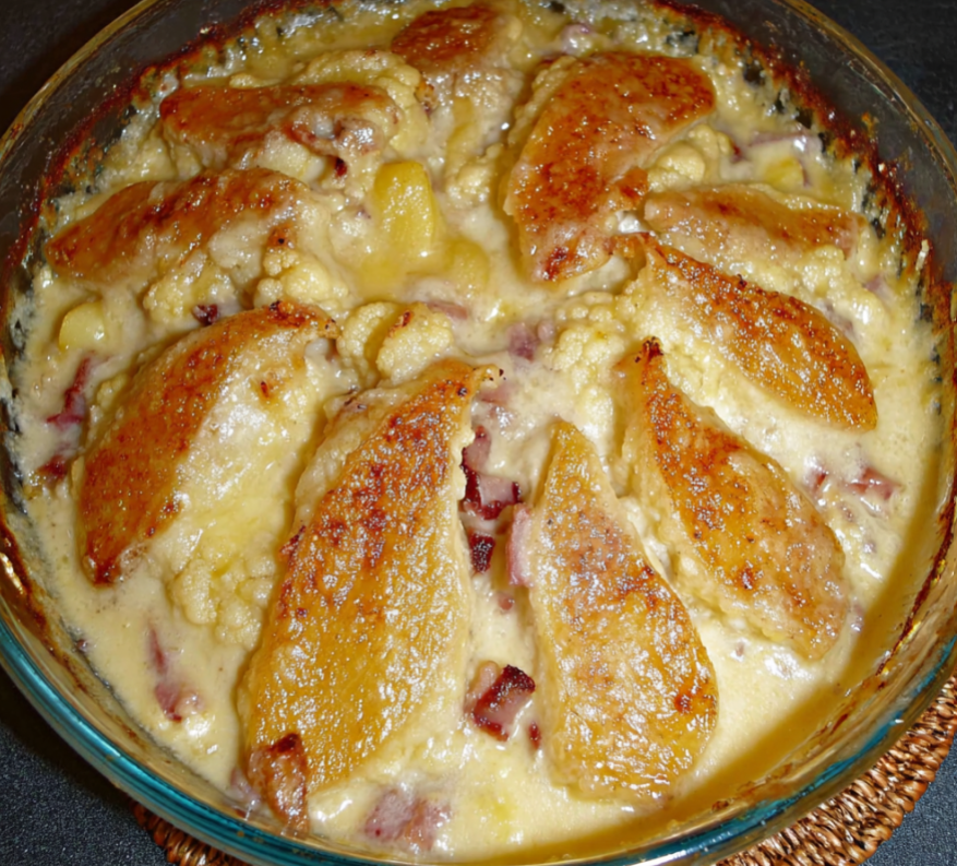 Ingrédients : Chou-fleur, lardons, oignon, vin blanc, crème, reblochon, sel, poivre, persil