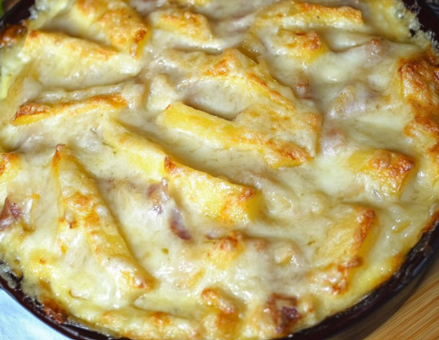 Garniture au fromage : Coupez le Reblochon en deux dans l’épaisseur, puis en tranches épaisses. Disposez les tranches de Reblochon sur le dessus du gratin, croûte vers le haut.