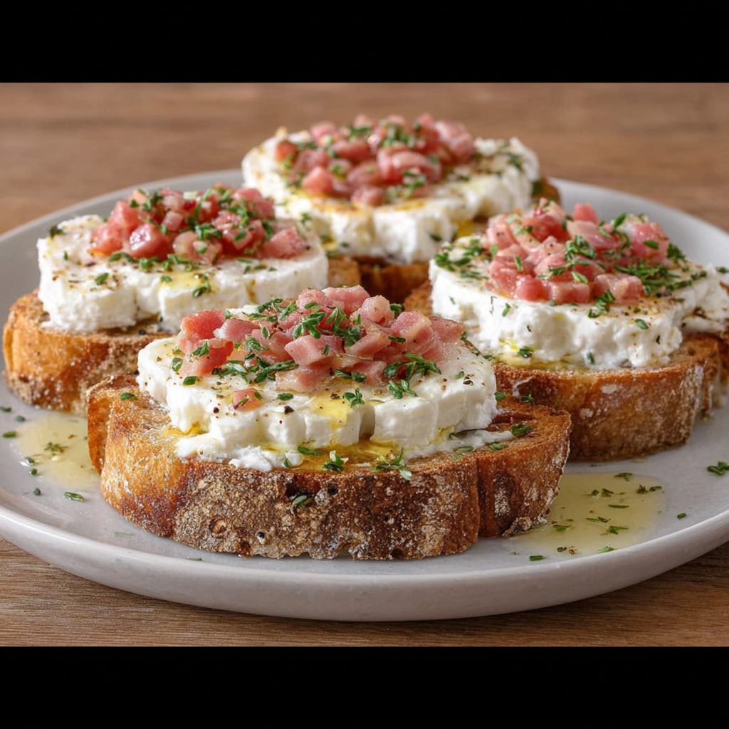 Le mariage entre le chèvre et les lardons est particulièrement apprécié. D’un côté, le fromage apporte une douceur crémeuse, de l’autre, les lardons offrent une touche salée et croustillante. Le tout est sublimé par une base de pain légèrement grillé, qui apporte structure et caractère au plat.