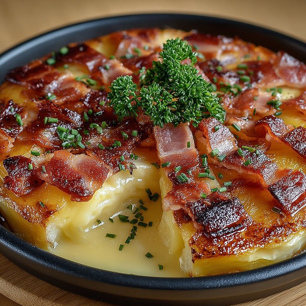 La tatin de raclette au bacon fumé et pommes fondantes est une recette généreuse et réconfortante, idéale pour les repas d’hiver. Inspirée de la célèbre tarte tatin sucrée, cette version salée revisite le principe du plat renversé en associant fromage fondant, fruits légèrement caramélisés et saveurs fumées. Elle séduit par son contraste entre le croustillant de la pâte feuilletée et le fondant de la garniture.