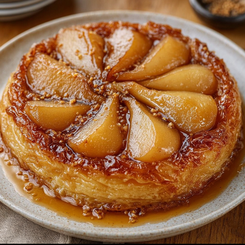 La combinaison du caramel, du beurre demi-sel, du gingembre et de la cannelle crée un équilibre parfait entre douceur, chaleur et légère intensité aromatique. Les poires deviennent fondantes et juteuses à la cuisson, tandis que la pâte feuilletée apporte une texture croustillante et dorée.