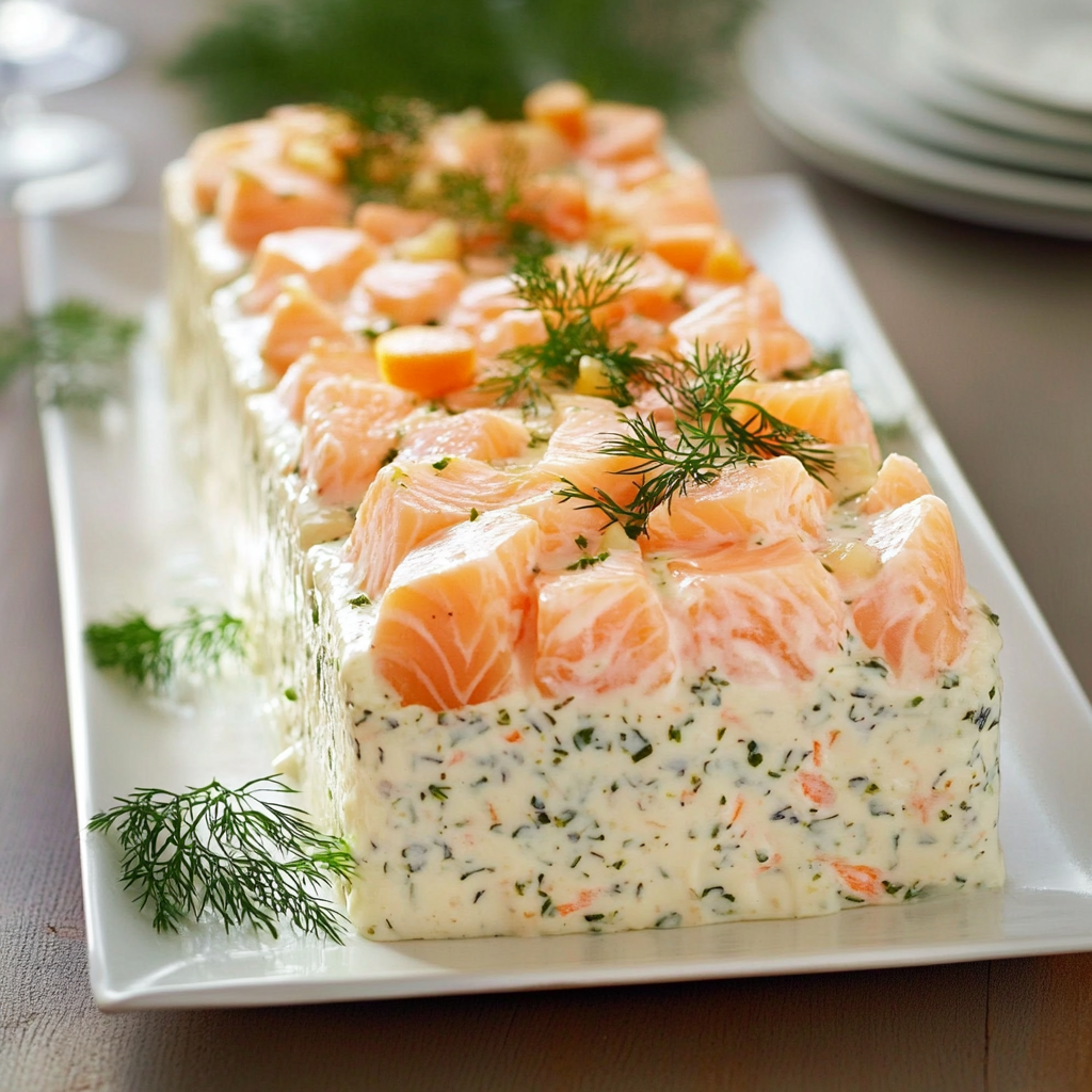 • Si vous le souhaitez, vous pouvez tapisser le fond de la terrine de fines lamelles de saumon pour une présentation élégante.