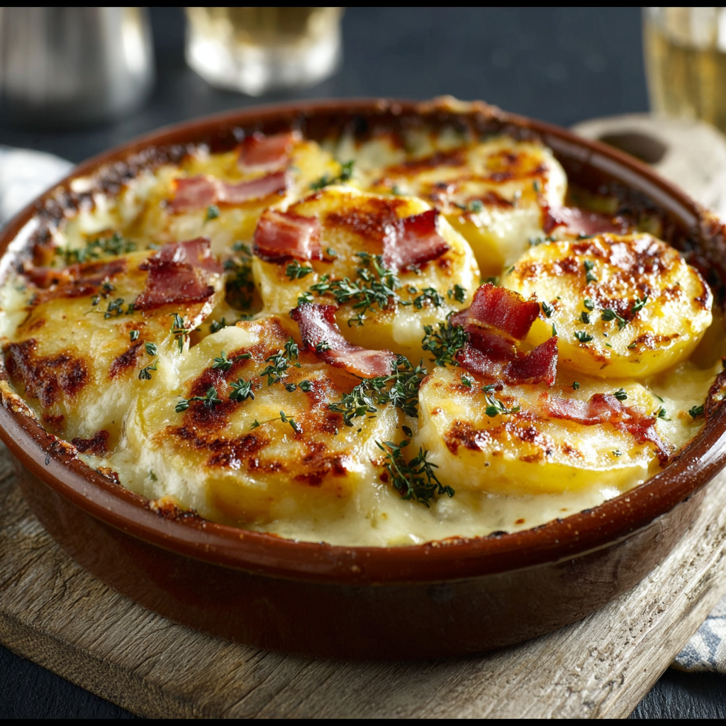 Astuce : Un plat en terre cuite ou en céramique permet une cuisson plus douce et uniforme, idéale pour faire fondre le fromage tout en dorant légèrement les pommes de terre.