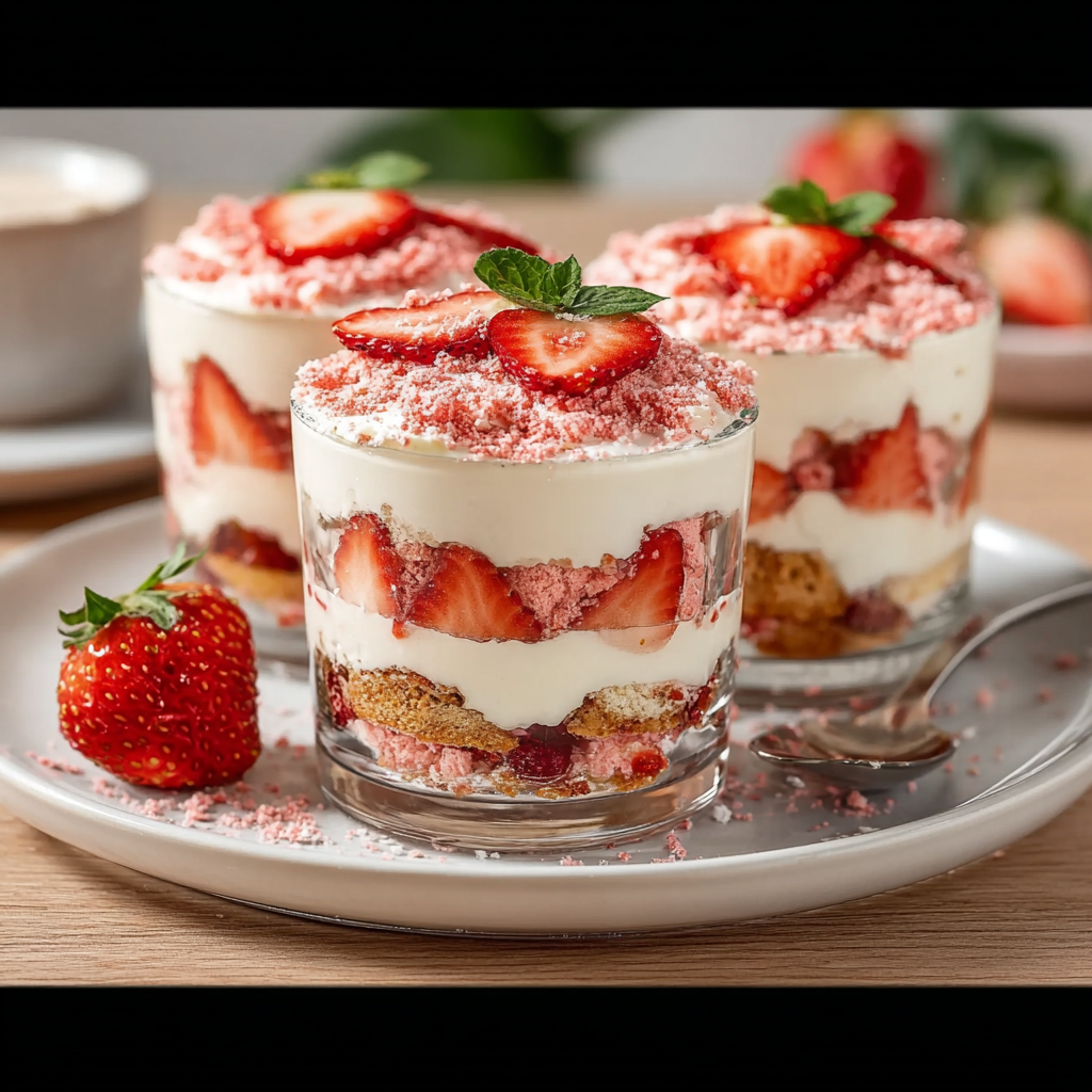 Le tiramisu aux fraises et biscuits roses de Reims est un dessert frais, délicat et particulièrement élégant. Facile à préparer sans cuisson, il allie la douceur du mascarpone, la fraîcheur des fraises et le charme unique des biscuits roses pour offrir un dessert aussi beau que délicieux.