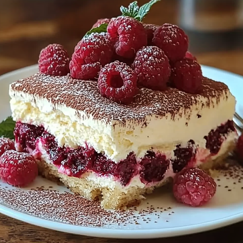Décorer avant de servir : Avant de servir, saupoudrez le tiramisu de cacao en poudre et décorez avec des framboises fraîches pour une touche de fraîcheur supplémentaire.