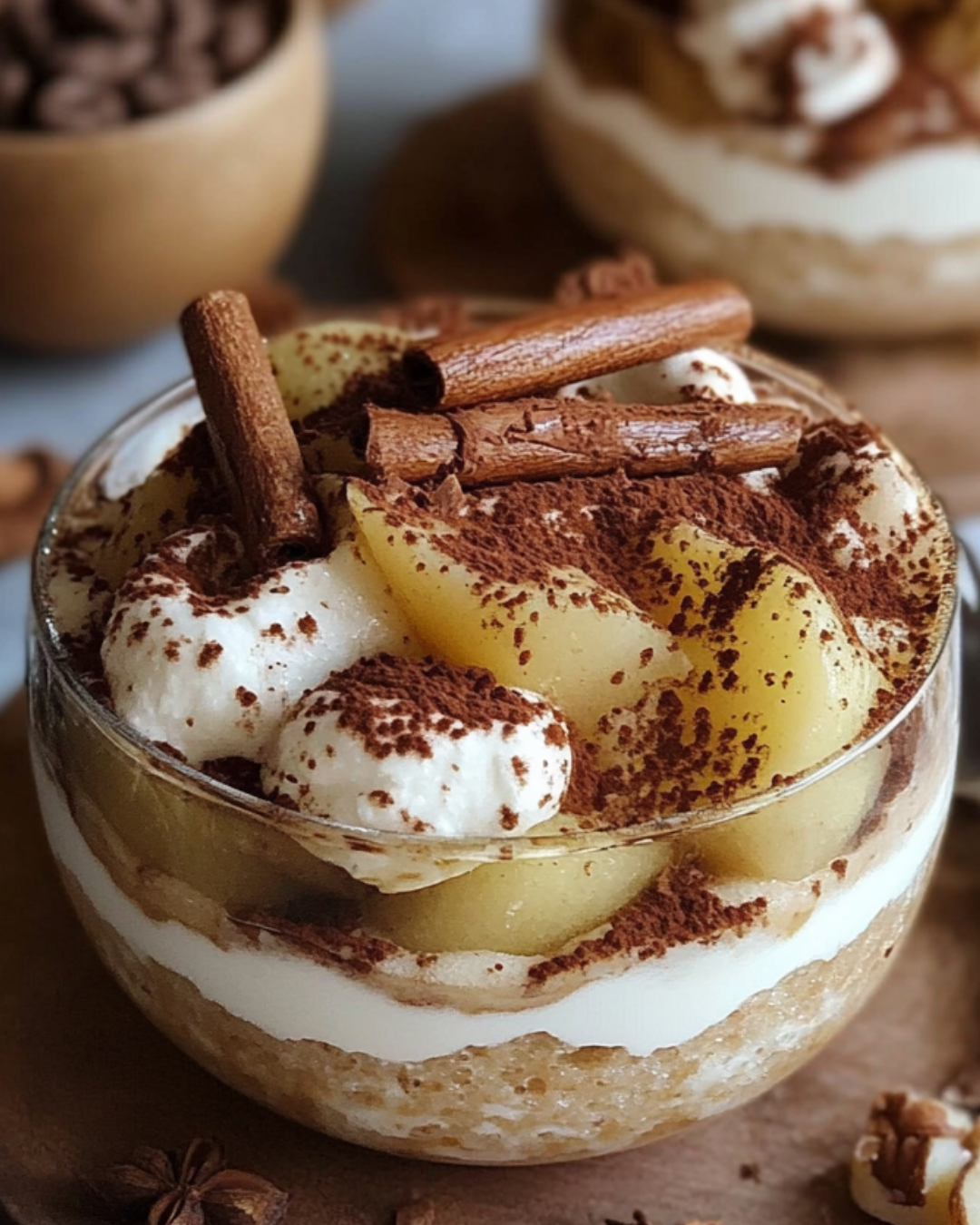 L’hiver est la saison des desserts réconfortants et gourmands. Ce tiramisu d’hiver aux pommes caramélisées et éclats de chocolat combine la douceur des fruits cuits à la chaleur du café et la richesse du mascarpone, créant une harmonie parfaite. Le chocolat noir haché apporte une touche finale qui élève la recette à un niveau de gourmandise supérieur, tout en restant un dessert léger.