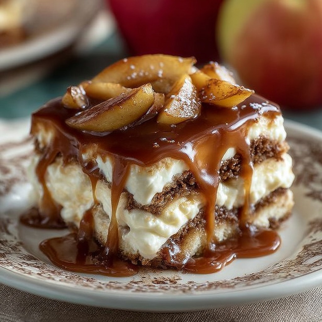 Le tiramisu doit reposer au réfrigérateur pendant plusieurs heures, idéalement une nuit, afin de permettre aux saveurs de se mêler et à la crème de se raffermir légèrement. Le repos assure également que les biscuits deviennent fondants sans perdre leur structure et que les pommes s’imprègnent délicatement du parfum du caramel. Avant de servir, une légère décoration avec de la cannelle ou un filet supplémentaire de caramel beurre salé peut être réalisée pour accentuer le visuel et les arômes du dessert.
