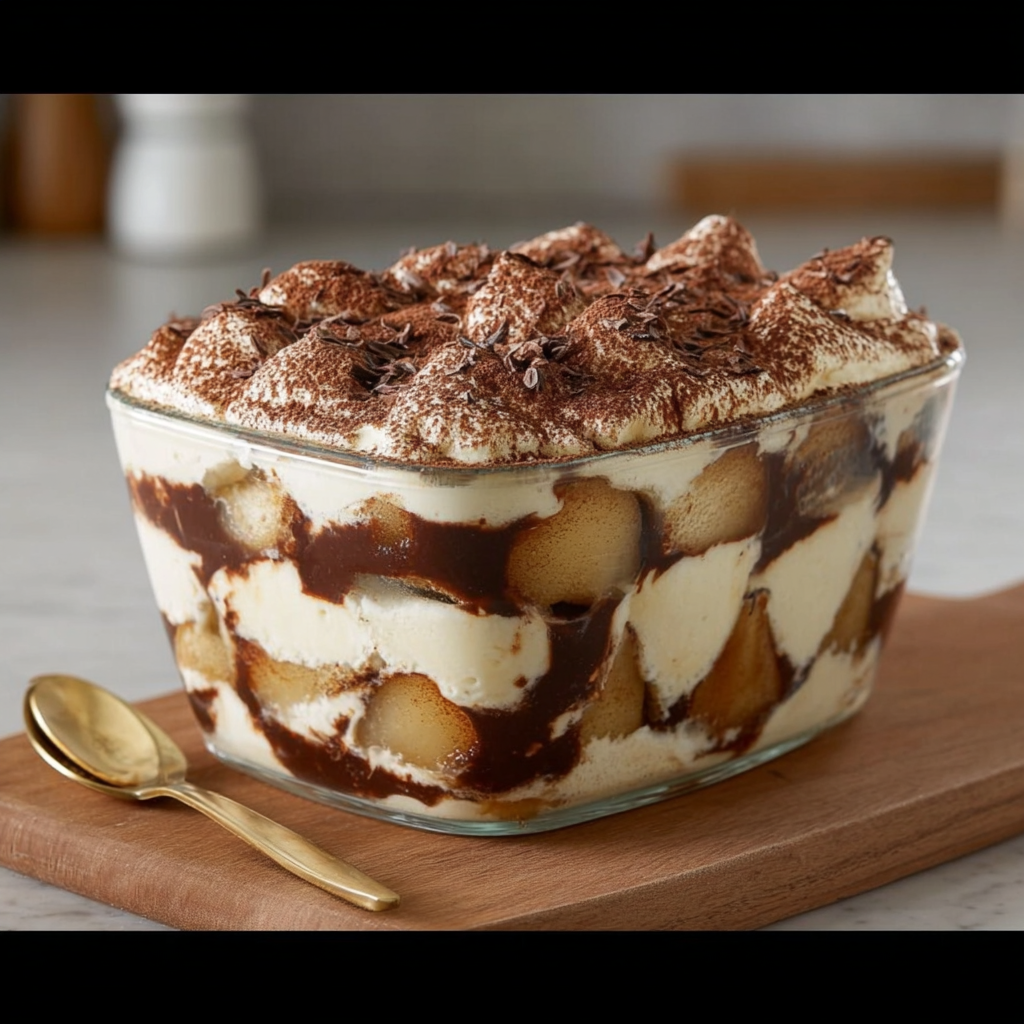 Le tiramisu poires chocolat est une déclinaison moderne et élégante du célèbre dessert italien. Il associe la douceur fruitée des poires, la puissance du chocolat et l’onctuosité de la crème mascarpone pour offrir une expérience gustative à la fois riche, équilibrée et raffinée. Contrairement au tiramisu classique au café, cette version est plus douce, moins amère et parfaitement adaptée à tous les palais, même ceux qui n’aiment pas le café.